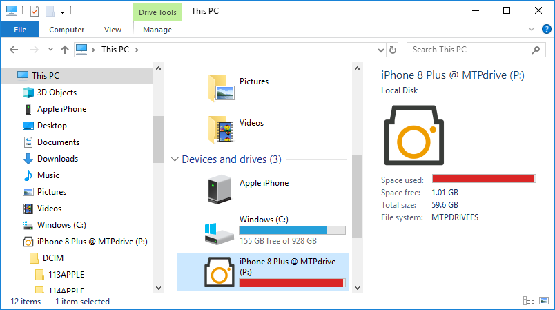 iPhone 8 Plus mapped to drive P: in Windows 10: